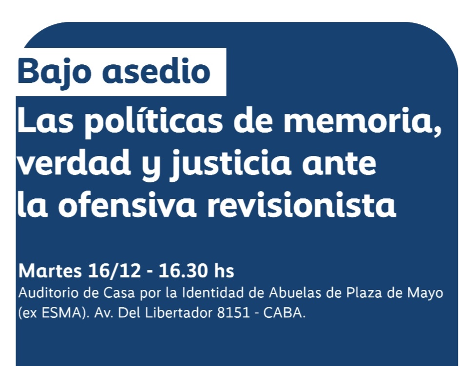 Abuelas de Plaza de Mayo, CELS, H.I.J.O.S Capital y Memoria Abierta, con el acompañamiento de las fundaciones FES Argentina, Heinrich Böll y Rosa Luxemburgo, invitan a la presentación del informe “Bajo asedio. Las políticas de Memoria, Verdad y Justicia ante la ofensiva revisionista”, el martes 16 de diciembre, a las 16. 30 horas, en la Casa por la Identidad del Espacio Memoria y Derechos Humanos, ex Esma (Libertador 8151, CABA). La actividad es libre y gratuita.